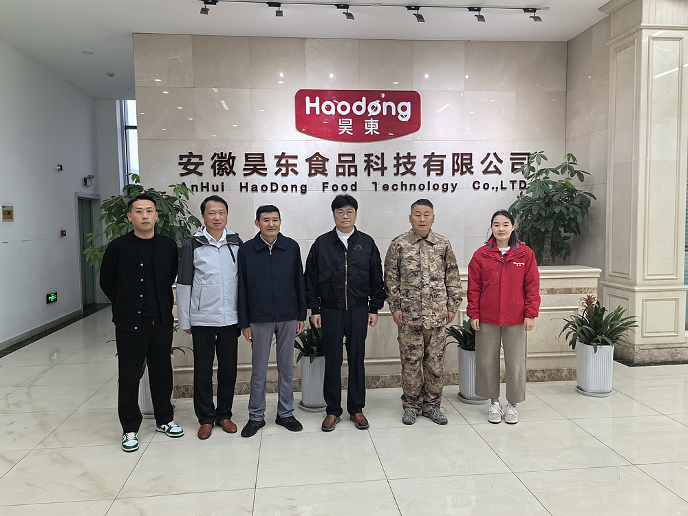 中國(guó)旅游協(xié)會(huì)旅游商品與裝備分會(huì)秘書(shū)長(zhǎng)陳斌(左4)、廬江縣人大常委會(huì)專(zhuān)職常委夏曉東(左3)、廬江縣旅游協(xié)會(huì)會(huì)長(zhǎng)朱焊群(左2)蒞臨昊東食品
